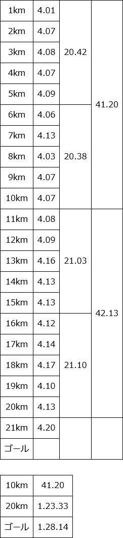 タイムは1時間28分14秒で、自己ベストより32秒遅いタイムだった。
