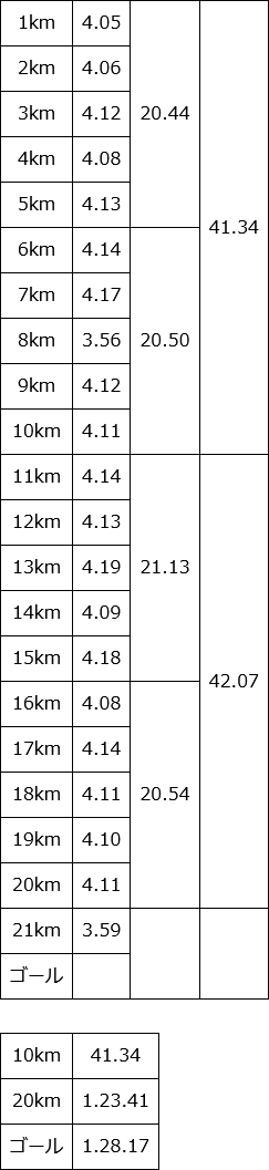 4.59, 4.48, 4.53, 5.01, 4.58, 4.58, 4.45, 4.50, 4.47, 4.56, 4.54, 4.53, 4.48と、12.9kmを1時間03分01秒で、キロ4分53秒ペースだった。