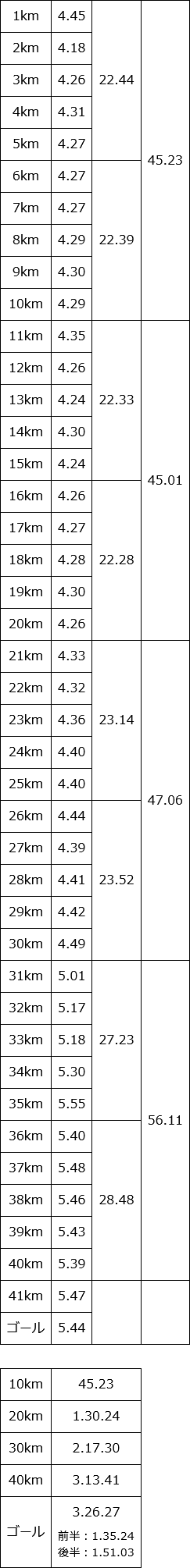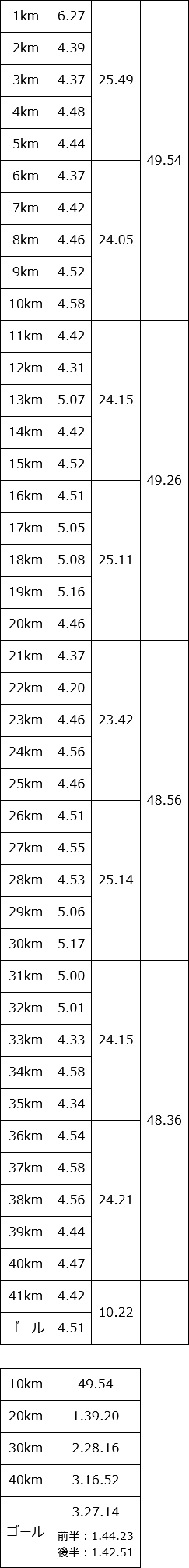3.58, 4.08, 4.22, 4.00, 4.17, 4.47, 3.43, 4.14, 4.12, 4.04, 4.10, 3.45と、11.76kmを48分49秒で、キロ4分09秒ペースだった。