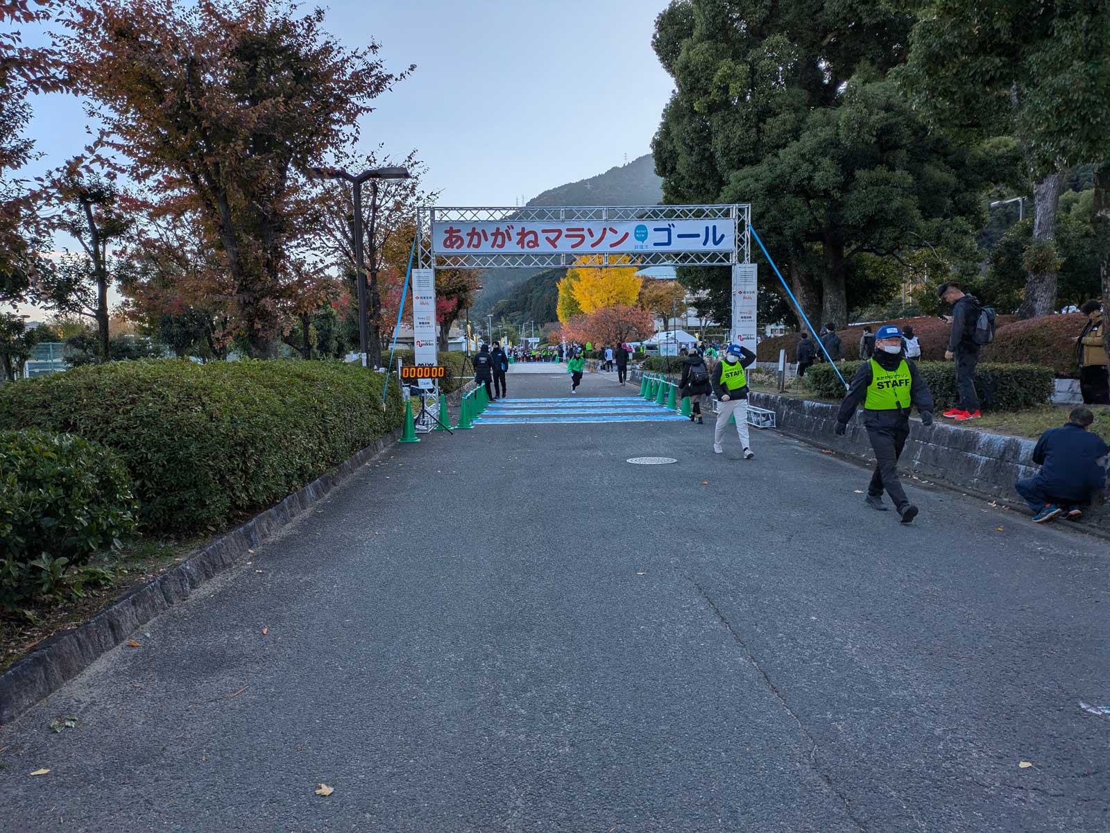 ゴール地点ではOS1を配布しているボランティア学生がいたが、OS1が美味しく感じた。 なので軽い脱水気味なのだろうか…… 一気に紙コップ2杯飲み干した。 給水所でスカイウォーターを飲み、すぐ先でアリナミンを貰って一気飲みし、完走メダルをもらって、地獄のような30段くらいの階段を上って、豚汁をもらって…… ゴール後のウイニングロードを歩いていくが、この道が上り坂か階段なのがきつい…… 数年前、ゴール地点を坂の上ではなく、坂の途中に変えたので、どうしてもゴール後に坂の上まで行かなくてはならないので、このような導線になっているが、今日みたいなレース展開の場合はゴール地点が少しでも下にあって助かったと思っている。