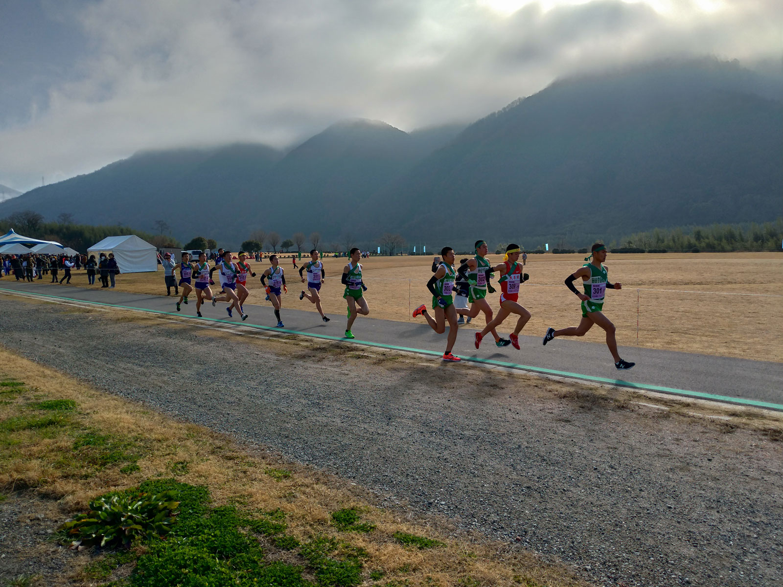 すぐ横の人が、自分と同じように結んだ紐がほどけず苦労していたので、暖かくなった自分がほどいてあげた。 ランナーがつけているゼッケンにはランナーの住んでいる都道府県が、徳島県民に関しては市町村名が書いてある。 この人は岐阜県と書いてあったので、「岐阜から来たんですか?」と話しかけて軽く雑談した。