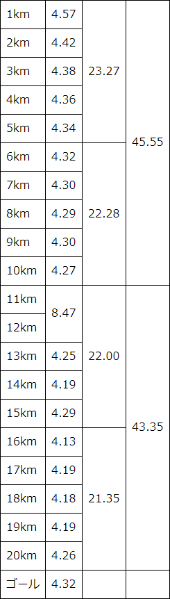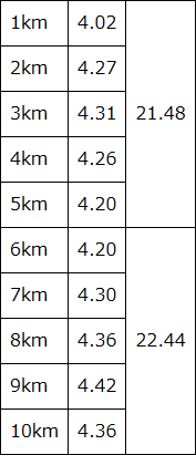 10km=44.32=4.27ペース