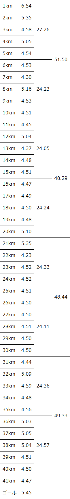 39kmを5.11、40kmを5.09でカバーして、再びペースを上げることに成功した。