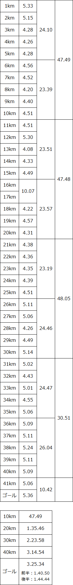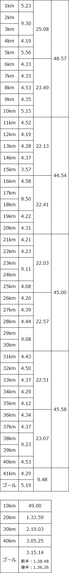 30kmまでの10km毎のラップを見ていくと、10kmでの誤差が17秒しかないので、ほぼ一定のペースではしれていたことになる。 ラスト10kmで、20秒ずつくらい落ちたので、レース内容的にはあまりよくなかったが仕方がない。