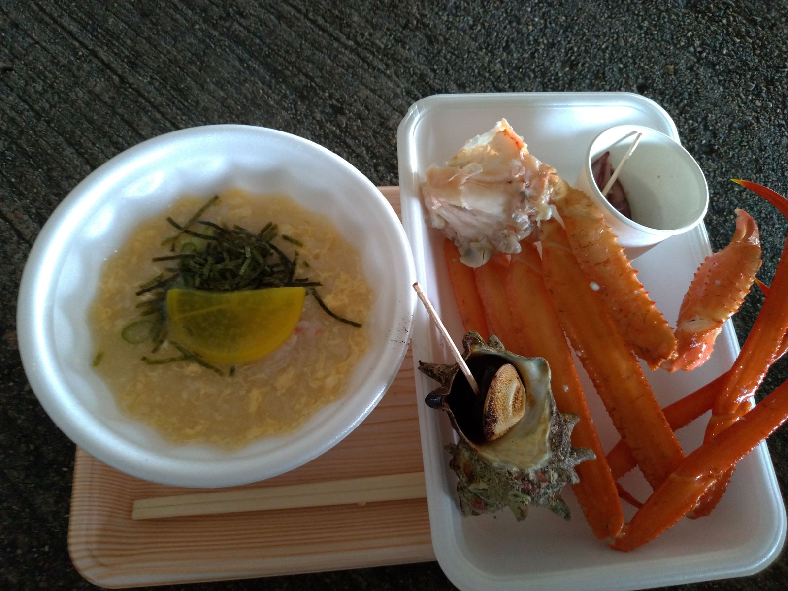 服を着込んで、ゴール後のおもてなしの蟹雑炊を貰いに行く。 蟹雑炊、ホタルイカ、サザエをもらうことができて、地元の海の幸を堪能できる。 冷えた体に熱い雑炊が非常に美味しかった。 もちろん蟹もホタルイカもサザエも美味しすぎた!