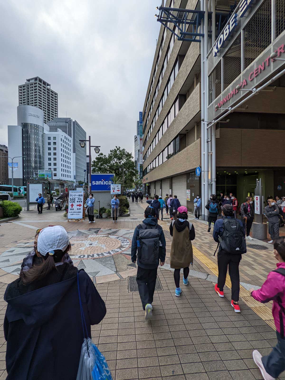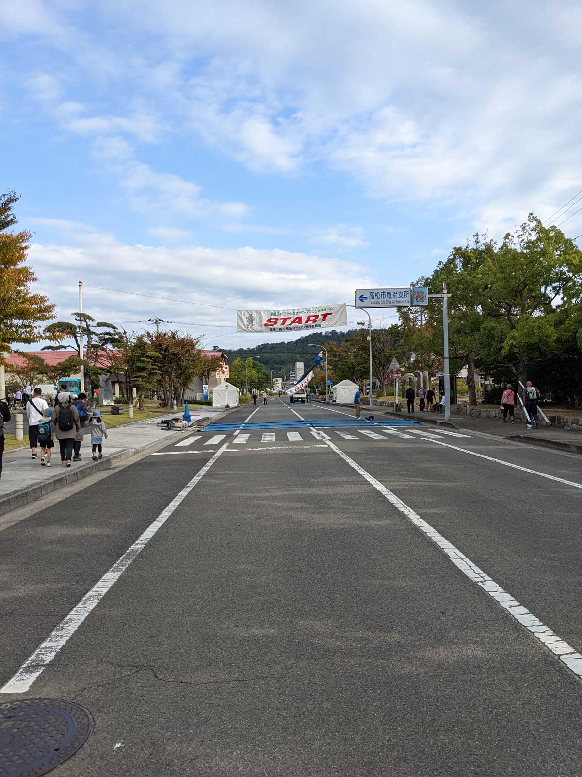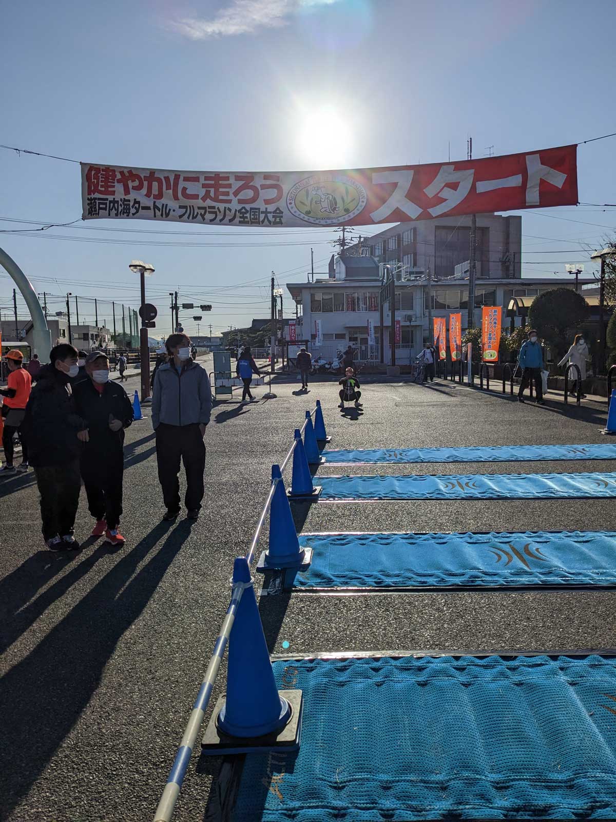 何度かトイレに行って、9時10分くらいになって体育館から外へ出る。 スタートは9時半で、並ぶ場所や順番は自由。 タイムも狙いたいので前方の方に陣取るが、普通に前の方に割って入ってくる人も多いので、ギリギリでも並べそう。 寒いのでダイソーのレインコートを着ていたけれど、スタート前になったら「そんなに寒くないや」と思ったが、今脱いでも捨てる場所が無い。 なので着たまま走って、給水所で捨てるか。