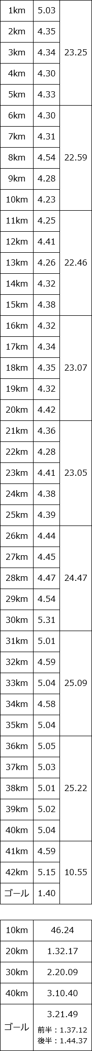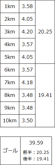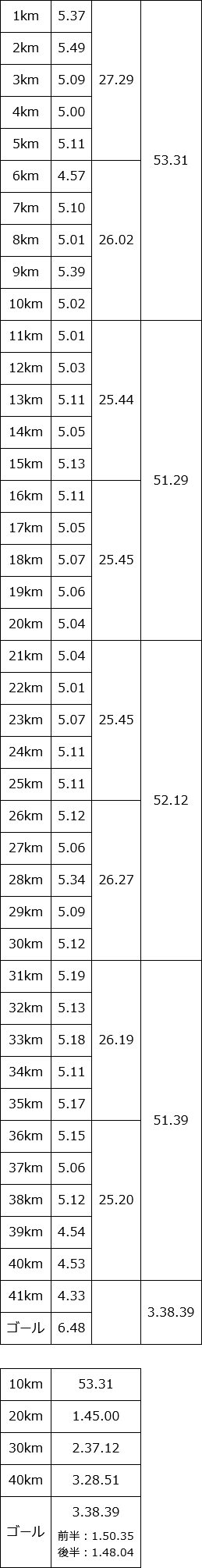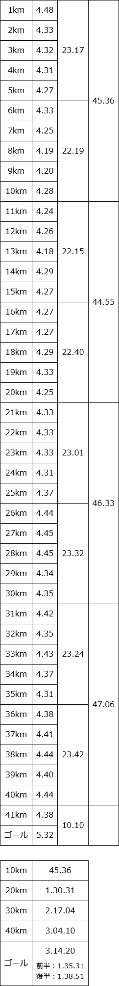 18~20kmまでは3.55, 3.53で耐えて、残り500mくらいからスパート。 下り基調なのもあって、最後の500mは3.12ペースまで上げることができた。 ゴール前の200mくらいは観客が多くて大声援を浴びながら声援に応えながら、その勢いのままゴール。
