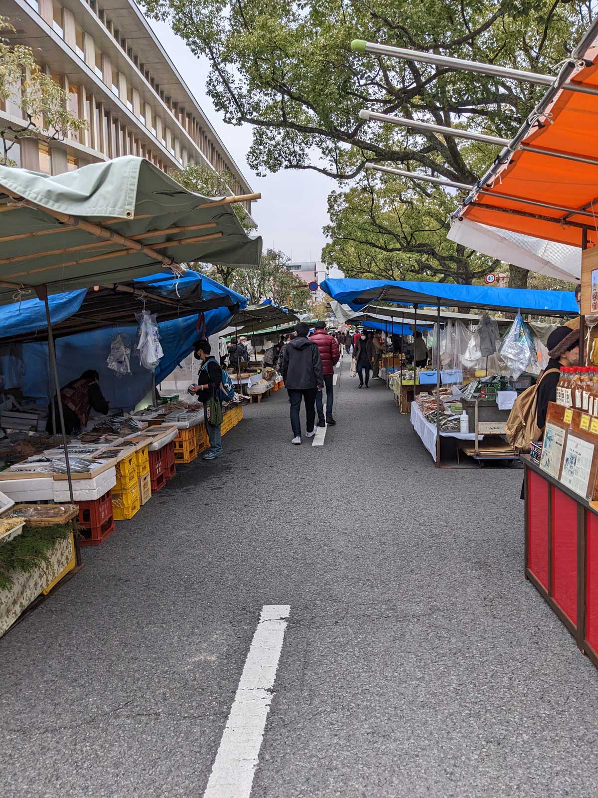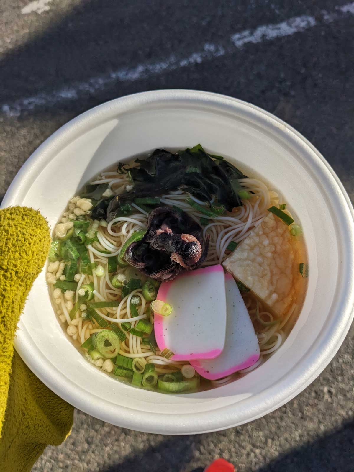 ゴールして、計測チップを外してもらい、ドリンクをもらい、コロナ禍後では珍しく紙の完走証を印刷してもらい、天ぷら・豚汁・ぜんざいの無料配布サービスがあり、ベンチに座ってそれらを食べた。