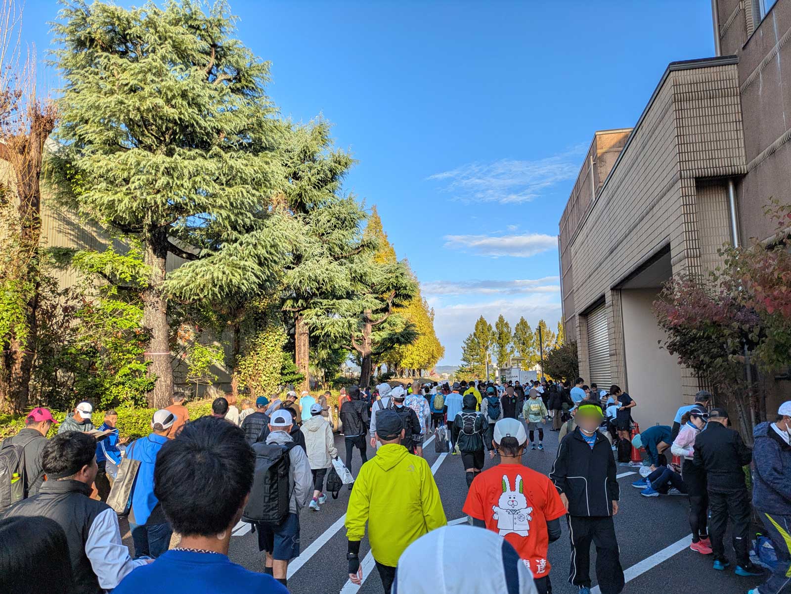 トイレには全部で3回行き、最終的な準備をしてから4回目のトイレへ。 もうスタート整列が始まっているので、トイレも結構混雑していた。 9時20分くらいから15分くらい並んでトイレを済ませて、9時43分くらいにスタートの整列へ。 整列は9時45分まで、スタートは10時だったが、実際にスタートブロックがしまったのは55分くらいだった。