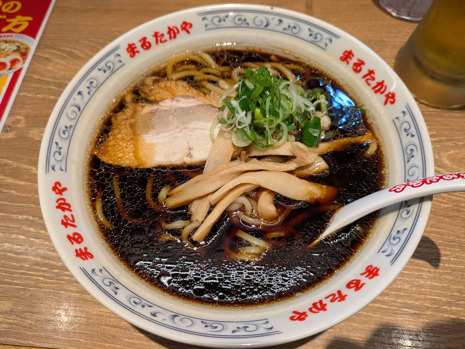 お昼ご飯を食べたいと思ったけど、どの店も大行列でとても並んでまで食べる元気が無かった。 富山駅の南口に行って、通りを歩いていたら「まるたかや」というラーメン屋があったので、そこで食べることに。 ビール、富山ブラックラーメン、おでん盛り合わせ、玄という日本酒を頼んでお腹いっぱい。