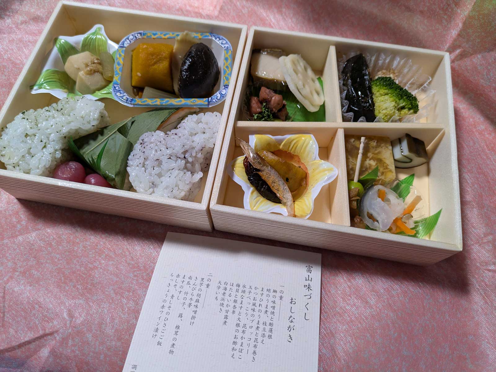富山駅に戻ってお土産などを購入し、その場で発送手続きをして香川まで送ってもらう。 駅の付近で駅弁が売っていたので、夕飯に食べようと購入した。 ホテル付近は徒歩圏内で行ける店が無いことは昨日把握していたので、今日の夕飯は駅弁か、またホテルのレストランでいいやって思って。