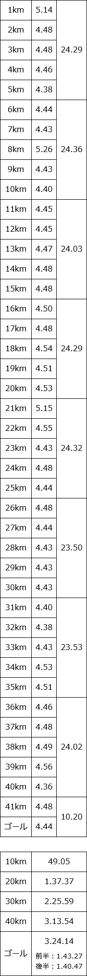 目標タイムには及ばなかったが、走り終わってみて、最後までよくもったなと思った。 15km地点での調子、20kmで3時間半のペースメーカーに追いつかれる。 前半でトイレに行ったのもあるけど、タイム的にはネガティブスプリット。 5km毎のタイムを見てもかなり安定している。 こういう走りを他のレースでもしたかった。
