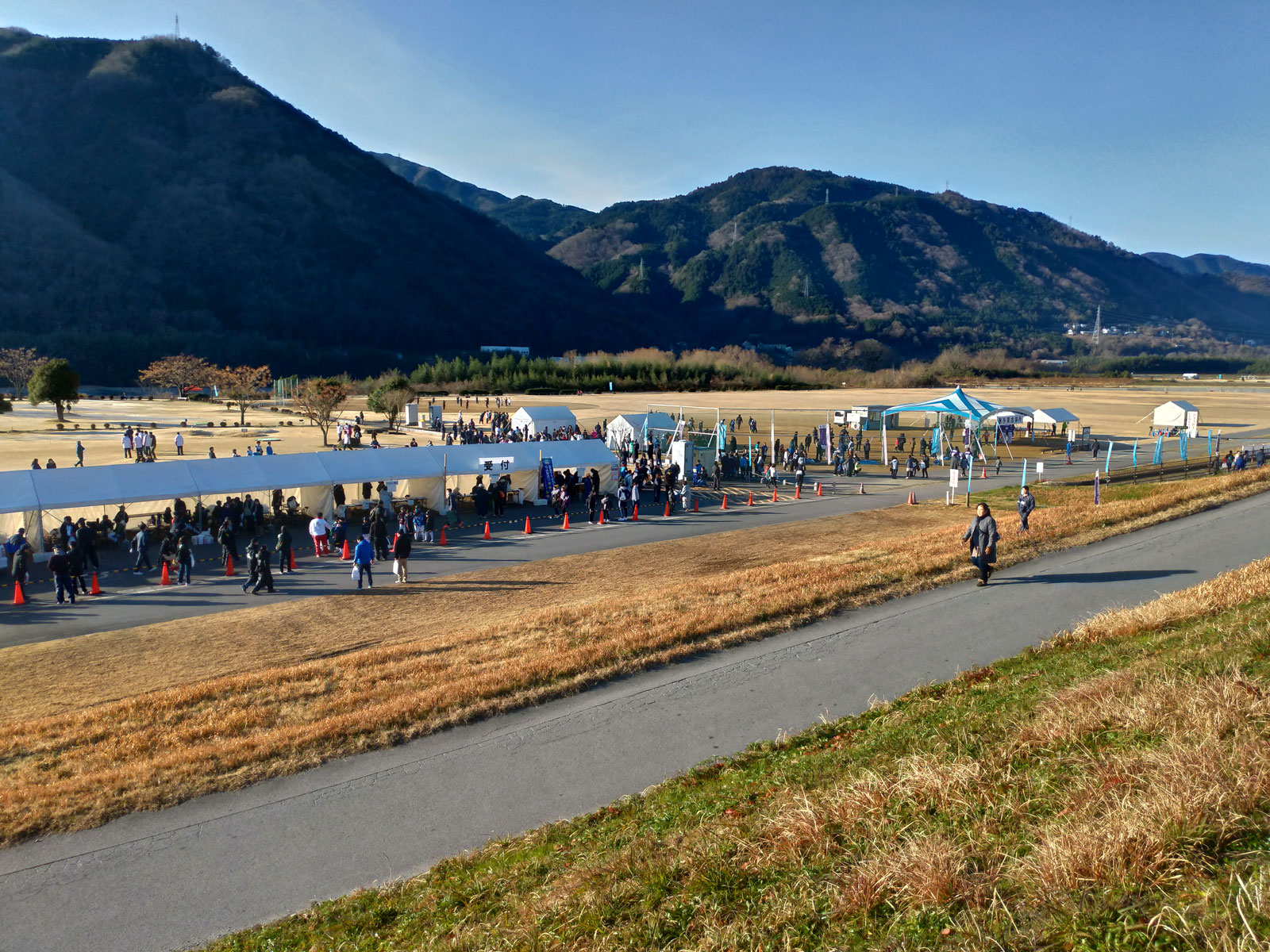 コンビニで自分の朝ご飯のパンとコーヒーを買い、国道438号線を通って徳島県つるぎ町を目指す。 三頭トンネルを抜けて徳島県へ。 この道を通るのも久しぶりだ。 山を下って、美馬インターから10分ほどで会場である四国三郎の郷に到着。 いつも駐車場として開放されている工事現場みたいなところが今回は使えず、駐車場の数が少なく大混雑していた。