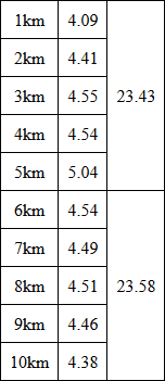 11km~20kmまでは、4.49, 4.48, 4.50, 4.54, 4.54, 4.49, 4.47, 4.51, 4.53, 4.58と、ずっと5分を切るペースで走っており、この10kmを48分33秒で走った。