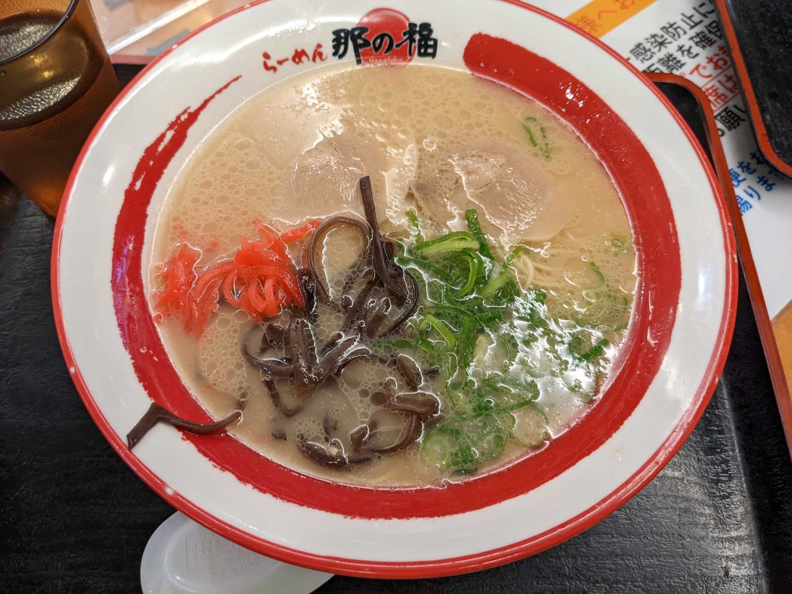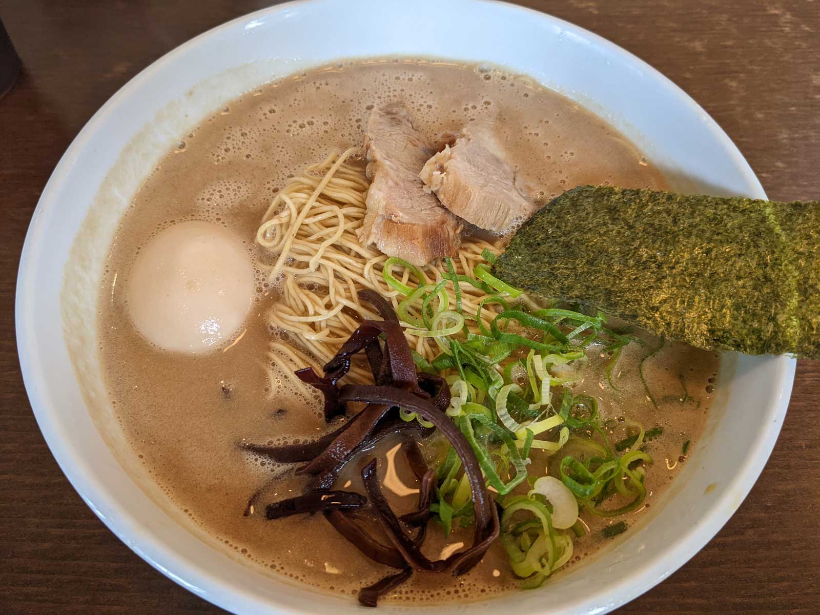 そのまま高速道路を走り、福岡ICで高速道路を降りる。 もう12時過ぎなので、お昼ごはんをどこかで食べなくては。 福岡なので博多ラーメンだなと思い、競技場に向かう途中にあった「天龍ラーメン」で、半熟煮玉子入りラーメンの大盛りを食べる。 天下一品もびっくりするくらいのこってり具合だった。 ラーメン好きの長男はあまり口に合わなかったようで、とんこつ独特の店の臭いがダメだったようだった……