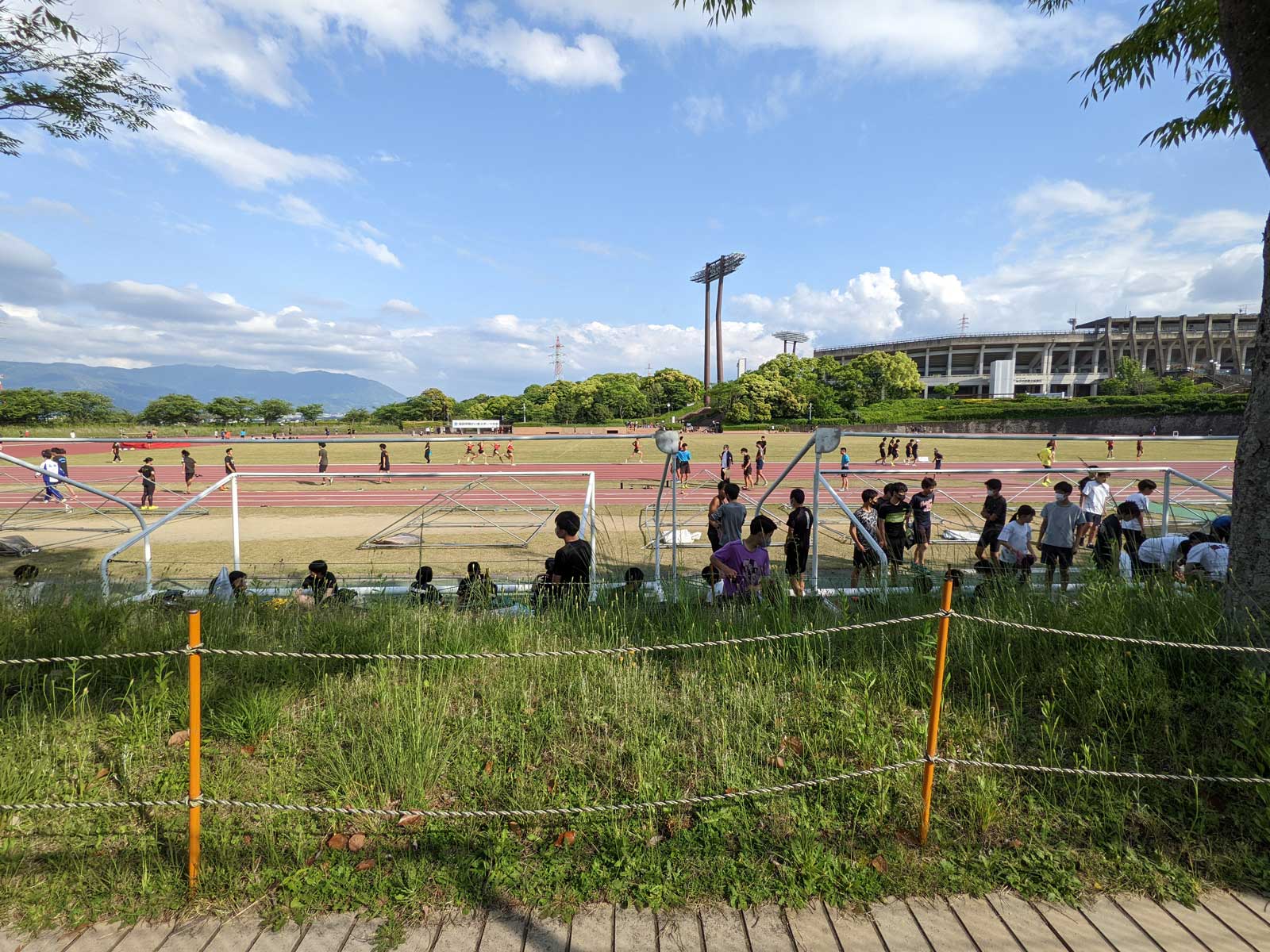 アップをした後、ラダーと縄跳びでで体を自由自在に使うトレーニングをし、1000m、400m、70mのタイムアタックをやってくれた。 福岡の人からしたら当たり前なのかもしれないが、競技場利用人数が多すぎるので大学生が前後右を囲む感じで隊列を組んで走ってくれた。 1000mが4分01秒、400mが85秒、70mのタイムはわからないが、大学生はスタート地点が100mのスタート地点だったが、それより速かったので12秒くらい?