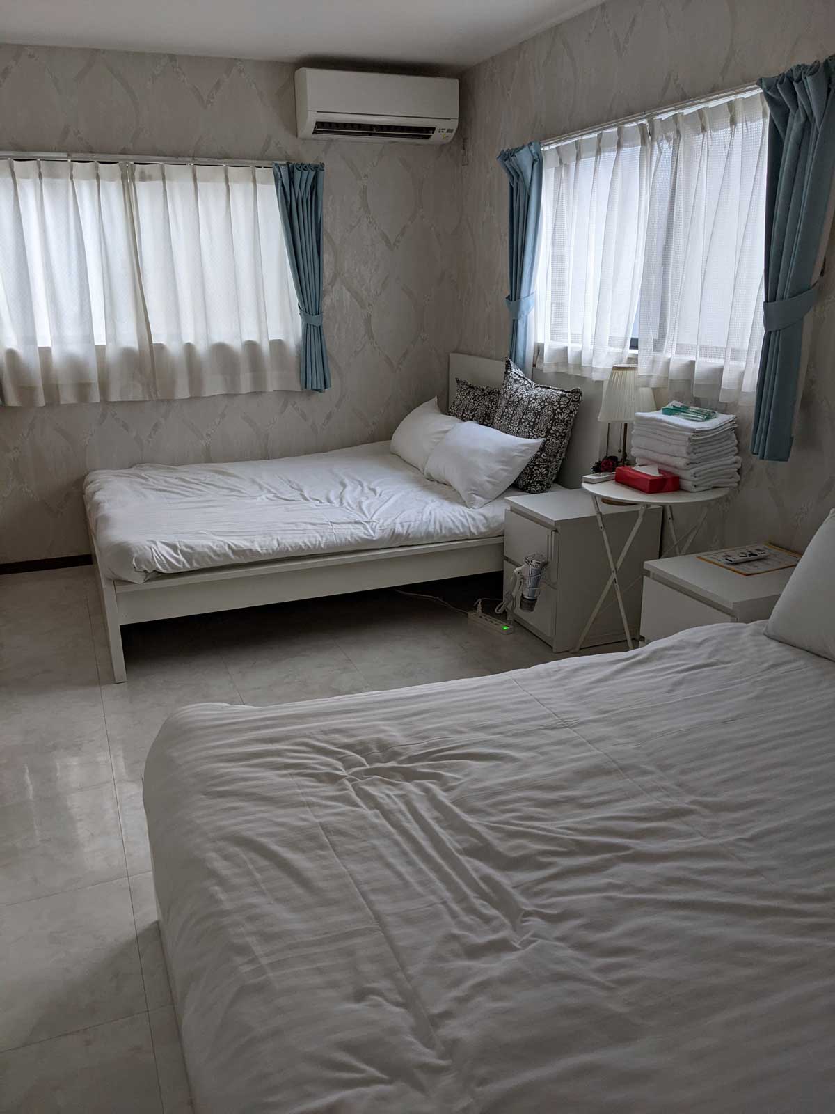 練習会が終わってからは、今夜宿泊する場所へ。 今回は大人2名、中学生1名、小学生1名なので、普通のビジネスホテルなどに泊まると、素泊まりで3万とかしてしまう。 どうせ寝るだけなのでAirbnbで宿泊先を確保しておいた。 1棟丸ごと貸し切りの一軒家「AIRSTAR博多ハウス」で、15,000円。 外観はオンボロ一軒家だけど、中はリフォームされていて綺麗。 ダブルベッド2つに、ソファベッド1つあり、4人で寝るには十分。 博多駅へも徒歩数分で行けて、コンビニも近い。 問題は駐車場だったが、徒歩5分くらいの場所に、18時~翌朝8時まで上限300円の場所があったので、そこに止めた。 そこが一番安くて、その駐車場から50mくらい離れた場所だと、上限1,500円とかあったので、探して良かった。