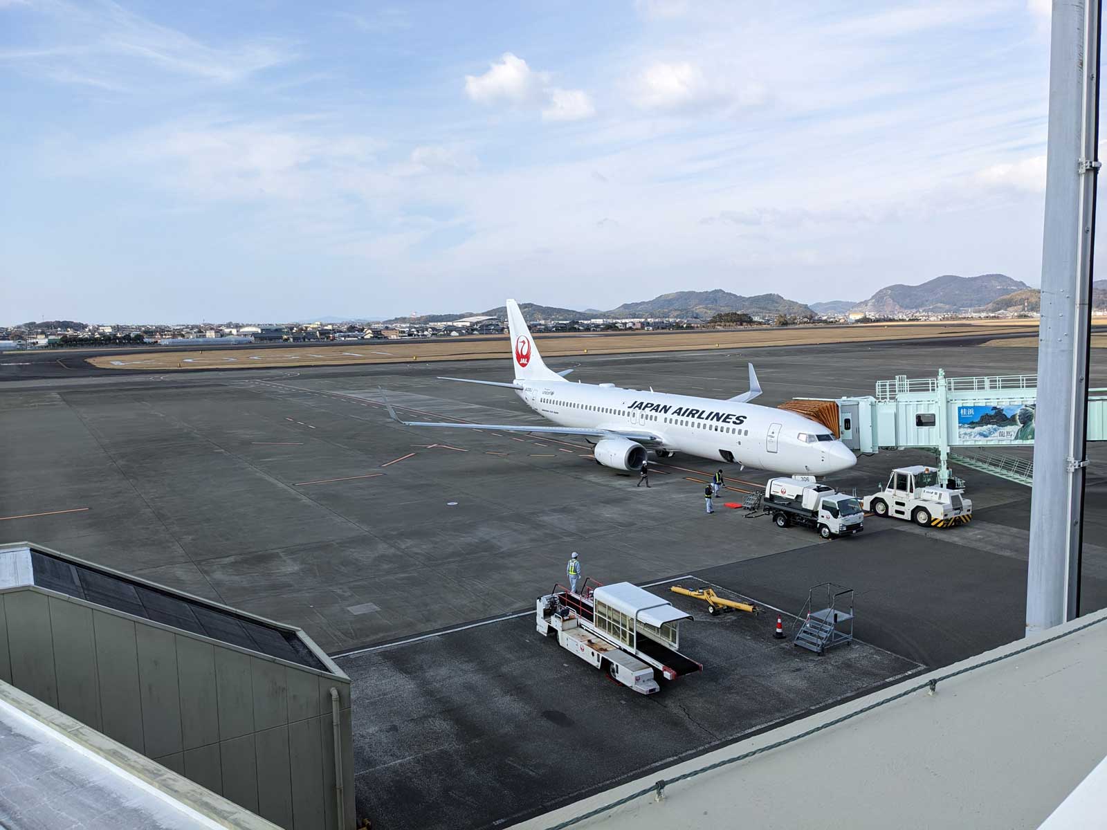 高知龍馬空港は高松空港と同程度かもう少し小規模な感じがした。 屋上に展望デッキがあったので空港を眺める。 左手の方には海が見える。 2007年、高知空港に前輪が出ないまま不時着したボンバルディア機の事故を思い出す。