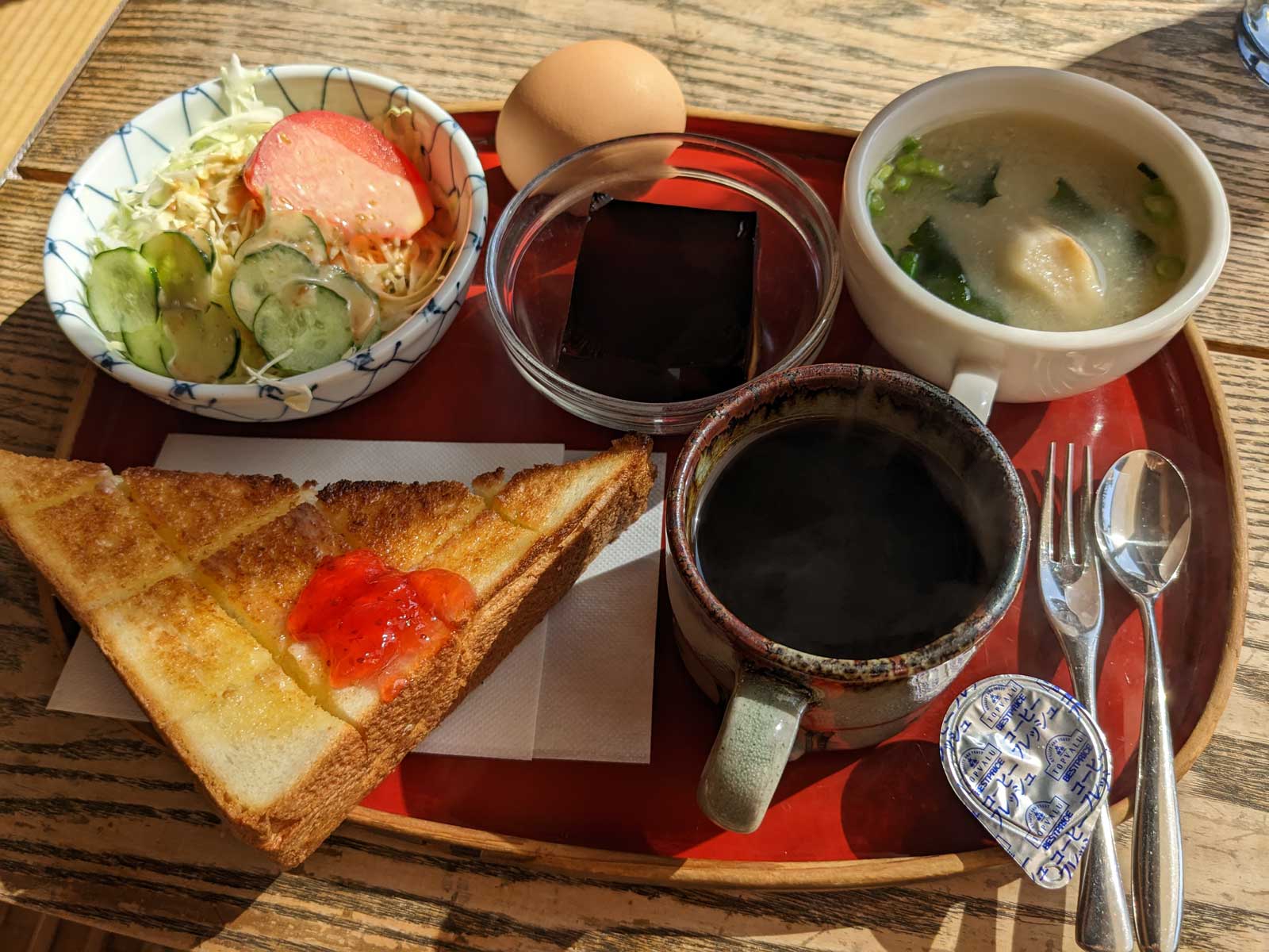 まずは「野良時計」というのを見る。 大きな駐車場が整備されていて、ここに車を止めて時計を眺める。 時計のすぐ横に和風の「高園茶屋」という喫茶店みたいなのがあったので、寄っていく。 さっき朝ごはん食べたばかりだけど、この喫茶店でモーニングセットを食べる。