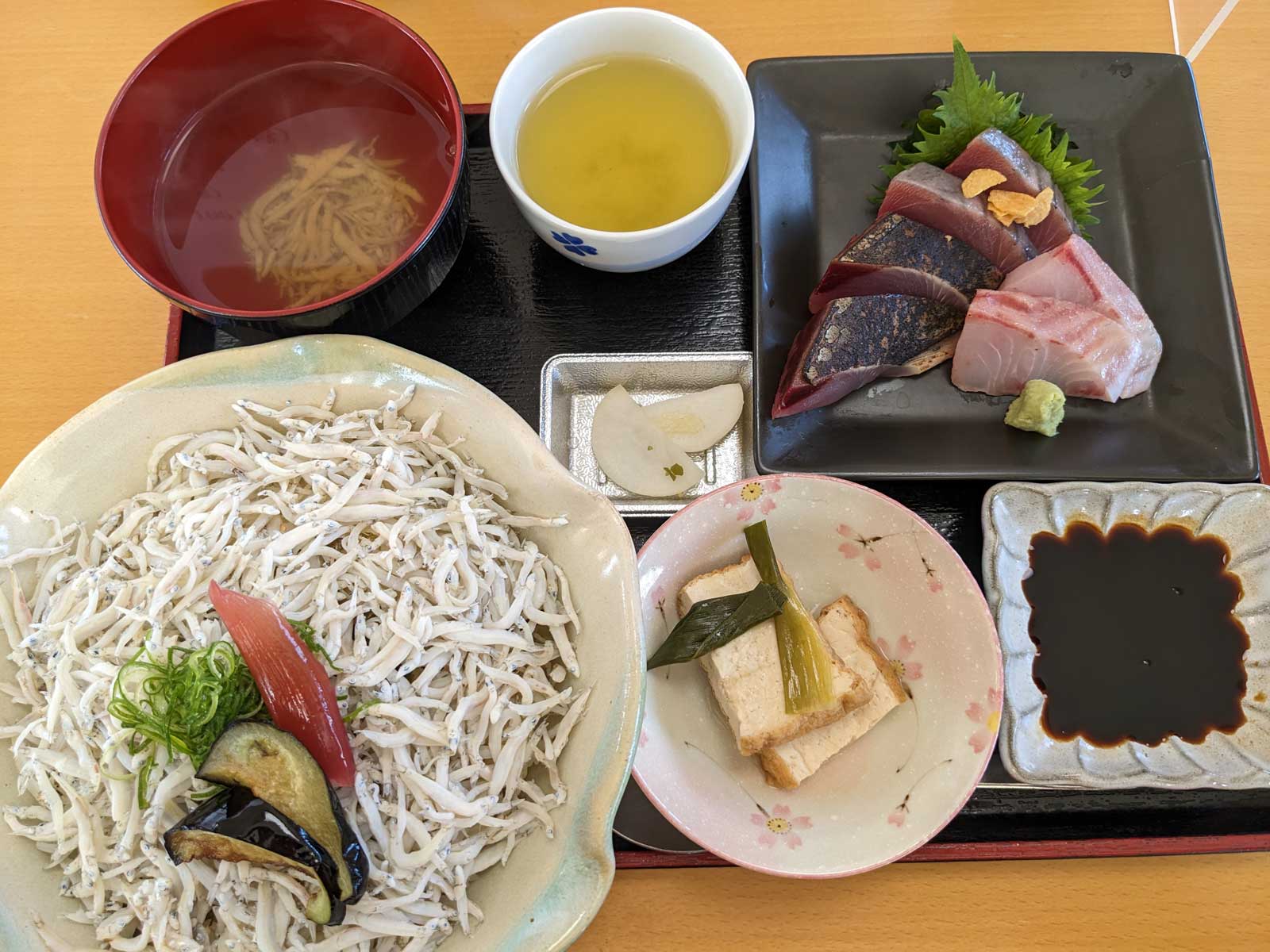 時間は12時半くらいになったのでお昼ごはんを食べに行く。 安芸名物のしらす丼を食べる。 海の方まで戻って「安芸しらす食堂」というお店へ。 平日だというのに4組待ちだった。 しらす丼と刺し身を食べる。 しらすは大量に乗っていて美味しかった。