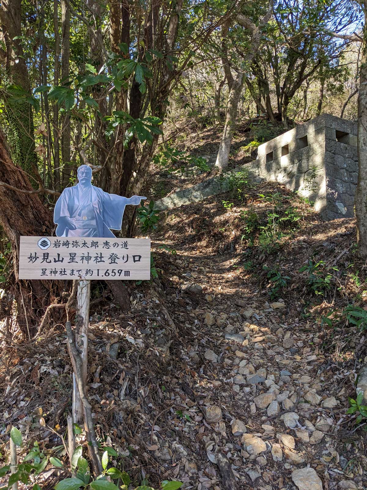 再び、岩崎弥太郎生家に戻る。 生家のすぐ横には、岩崎弥太郎が幼少期に頻繁に上っていた山と、その山の上に「星神社」というのがある。 せっかくなので、歩いて星神社まで登ってみようと思って。 岩崎少年は30分くらいで駆け上がっていたらしい。 ザックにお茶と防寒着を入れていざ出発。 2時間かからないくらいで往復でき、途中から見えた景色は絶景だった。