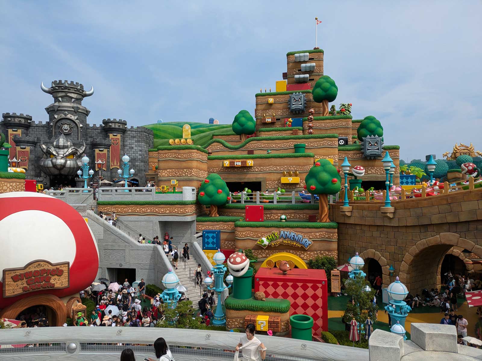 次はスーパー・ニンテンドー・ワールドへ。 入場整理券が配布中で、今チケットを申し込むと、入れるのは20時台っぽい。 このエリアにももちろんエクスプレスパスで入れる。 入口でキノピオのパワーアップバンドを購入しマリオの世界へ。 あまり大したことないんじゃないかと思っていたが、入ってみたらものすごいマリオの世界だった。