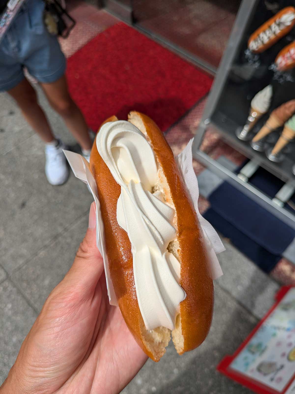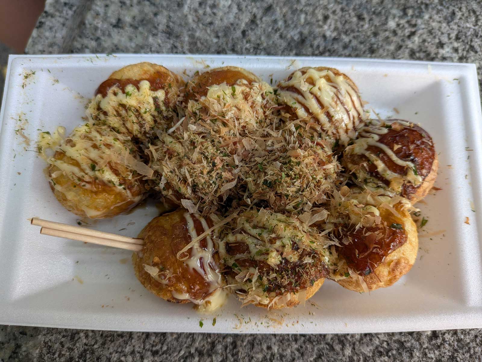 次はアメリカ村に徒歩で移動。 アメリカ村の三角公園前にある「甲賀流」というたこ焼きを購入したが、三女はお腹いっぱいで1つも食べなかった。 目の前にある「アイスドッグ」も食べたが、それも「組み合わせが悪くて美味しくなさそう」と言って、一口も食べなかった。