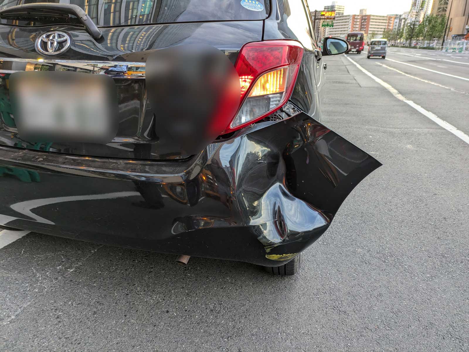 ナビを頼りに梅田ICを目指す。 大阪駅の目の前を通り、大阪駅の横の三叉路を左折したら300mで梅田ICだ。 さて、高速に乗るかと思って左折。 左折終えた瞬間に「メキメキ」という音が車後方から? 何か踏んだか?と思ってバックミラーを見たら、すぐ真後ろに巨大な車が、どうやら追突されたようだ…… すぐにハザードランプつけて車を止めて、後ろの大型車に近づいていくと、運転手が下りてきて「衝突しました、すみません」と。 「とりあえず警察呼んでください、ここ交差点直後で車じゃまなので、少し前に動かします」と言って20mくらい車を動かして警察が到着するのを待つ。