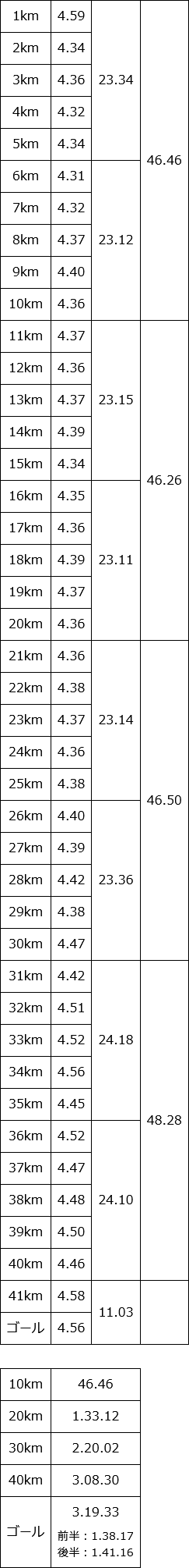 5.32, 6.37, 5.38, 5.34, 5.48, 5.54, 5.41, 6.27, 6.09, 5.46, 5.41, 5.27, 5.50, 6.43, 5.49, 5.53, 5.55, 5.40, 5.58と、18.2kmを1時間47分57秒で、キロ5分53秒ペースだった。