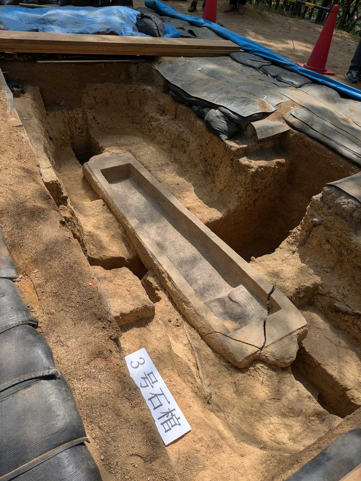 目的地は丸亀にある「快天山古墳」という古墳時代前期に作られた古墳。 令和6年度の発掘調査で3号石棺の蓋にヒビが見つかり、このまま埋め戻した場合、破損する恐れがあるため、蓋を全て取り外し、奈良県にある文化財研究所に運び、調査や補修作業を行っているらしい。 蓋が取り外されたのは75年ぶりのことらしく、次に蓋が取り外される時には自分は生きてないだろうから、最初で最後のチャンスだと思って、わざわざ見に来たのだった。