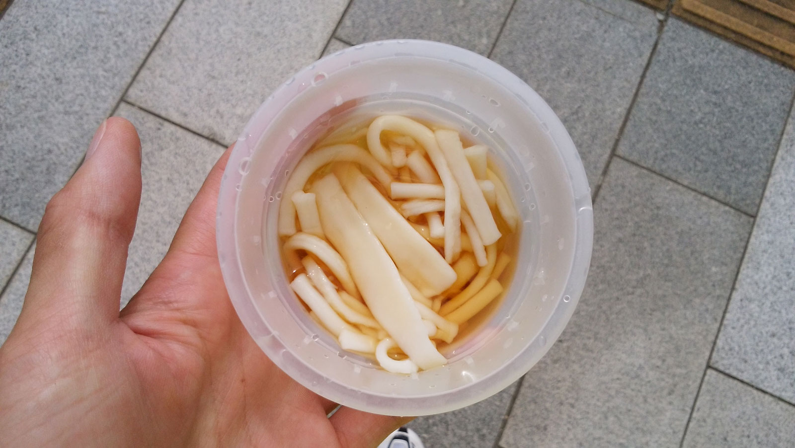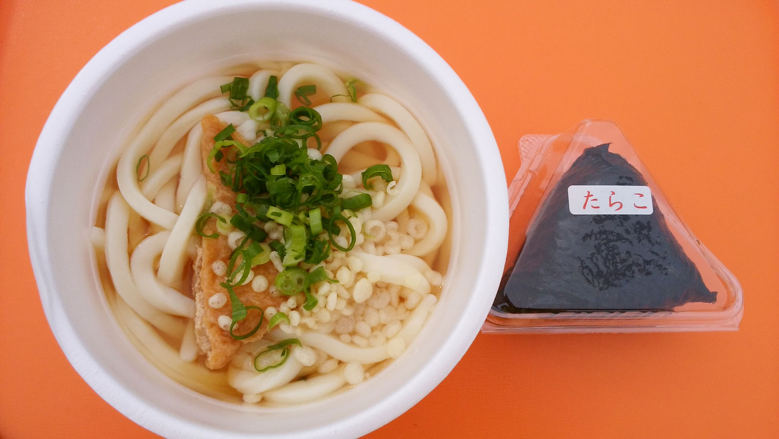 少し走り「小豆島観光協会」に到着。 ここが最後のエイドステーションとなっている。 うどん無料券を使ってうどんを食べ、これじゃ消費したカロリーと栄養補給が全然足りないので150円でたらこおにぎりも購入。 それを食べながら、目の前に広がるオリーブビーチと瀬戸内海を見てのんびりと休憩する。 エイドステーションでもらったカリカリ梅が美味しかった。