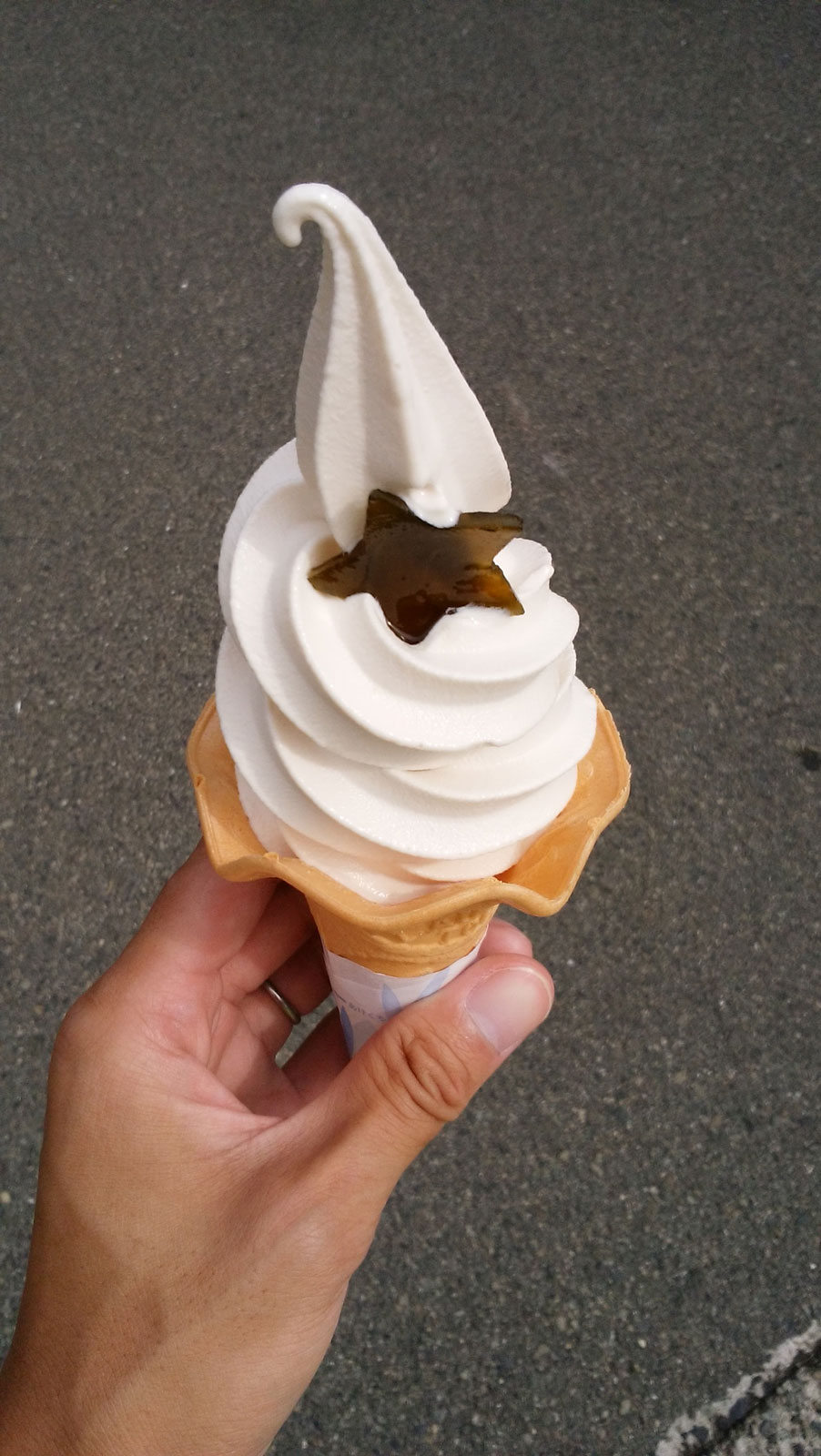 休憩を終え、ここからの地獄に向かって進んでいく。 約3km走った付近で70kmコースと95kmコースが分離。 70kmコースは直進しトンネルを進んでいく。 95kmコースは右折し、県道248号線を走っていく。 この県道が今までの道より勾配のきつい上り坂になっている。 その上り坂を1.2km走ったら一旦落ち着いて左折なのだが、そこから先、さらに急な800mの上り坂に道が変わった。 なんとかその坂も乗り越えて、ようやく一息つけるような道になった。 細い山道を細かい下りを繰り返しながら進んでいく。 けっこう気持ちよく走ることができ、県道28号線を走っていくと「つくだに屋さん」という場所に到着。 ここは協賛社で、通常だと300円する「佃煮ソフトクリーム」を100円で提供してくれる。 それを食べながら休憩する。 佃煮ソフトクリームは普通のソフトクリームに昆布の佃煮が付いているだけだったが、佃煮がしょっぱくて美味しかった。