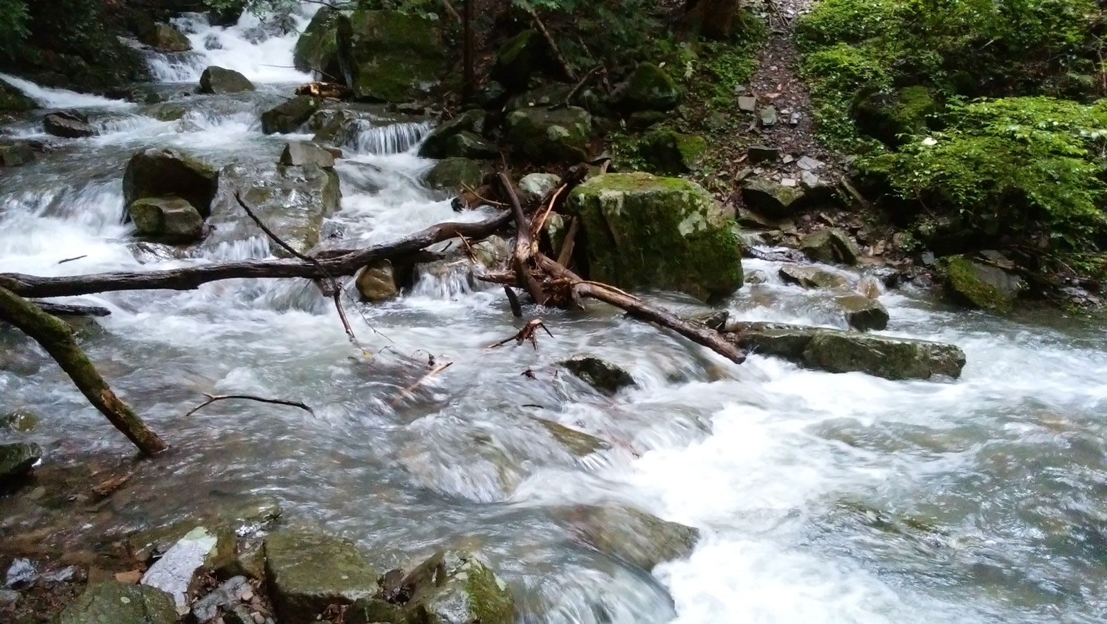 渡渉ポイントを2箇所越えて瀬場谷を目指して歩く。 徐々に明るくなってきて、瀬場谷に着いた時点でヘッドライトが不要なほどの明るさになったので、ヘッドライトは収納にしまう。 さぁ、登山口までもうちょっとだ。 ここから先は淡々と歩くだけなので、睡魔との戦いになった。 やはり徹夜で登山だと眠いなぁ。 下りは面白みが無いので眠気も襲ってくる。 登りはすごいワクワクしてて高揚してたので全然眠くならなかったのだけど。