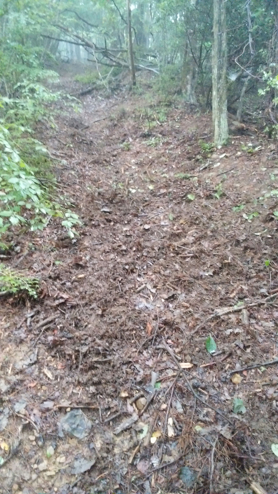 ここで、登りの時に左ルートを選択して良かったと思った。 右ルートはかなり荒れていた。 土砂ではないけど、大雨と数十センチくらいの石がゴロゴロと流れた跡があって、非常に歩きにくい。 歩きにくい区間はかなり続くし、終わったと思っても、また歩きにくい区間になったりで。 下りだから歩きにくいのは我慢できるが、登りだったらイライラしてきそうなほど、歩きにくかった。