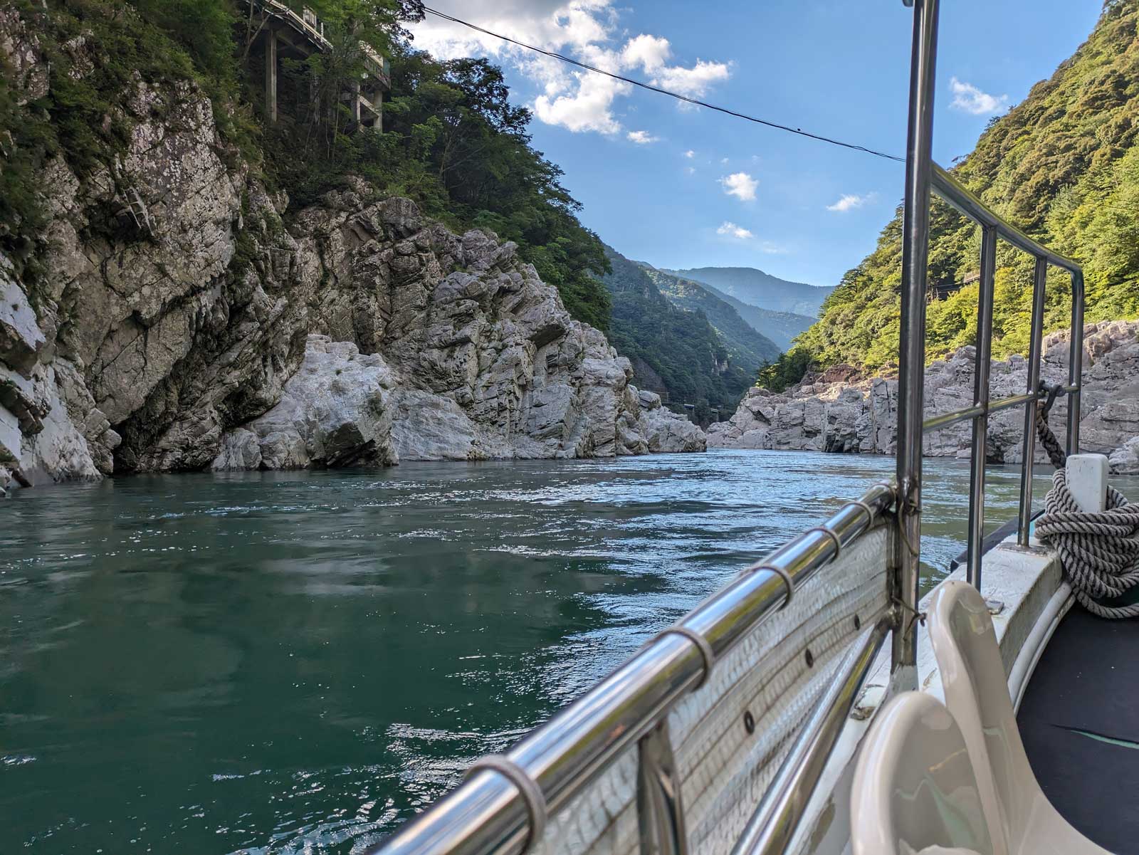 レオマとか岡田駅の前を通る道から満濃公園の西側の門の方を経由して、財田付近で国道32号線に合流する。 道の駅財田で休憩してから、2年くらい前に開通したトンネルを抜けて徳島県へ。 国道32号線をひたすらと走り、大歩危小歩危渓へ。 もともと、大歩危の「まんなか」という施設の観光遊覧船に乗る予定で、時間的に乗っても間に合うので乗っていくことに。