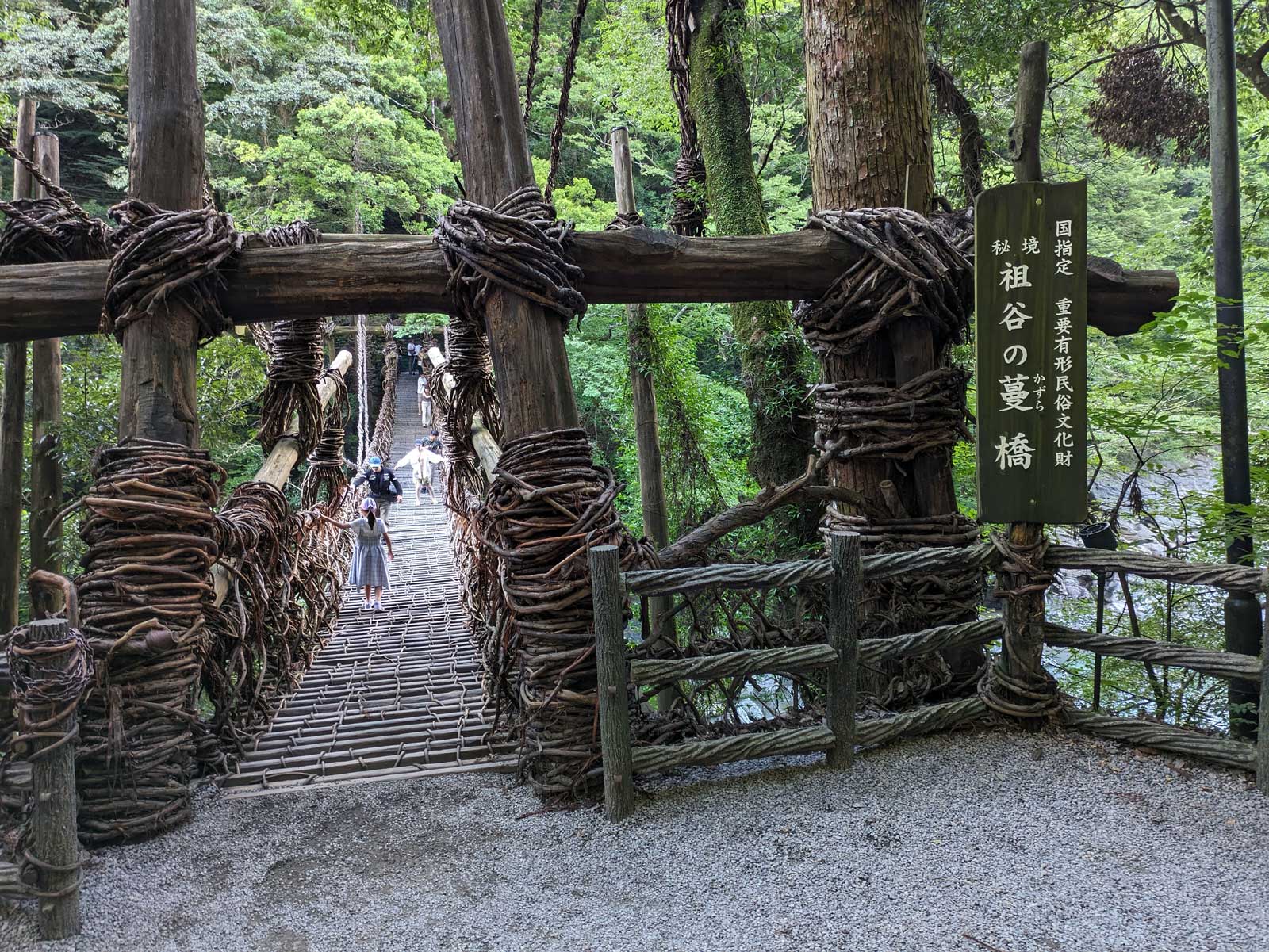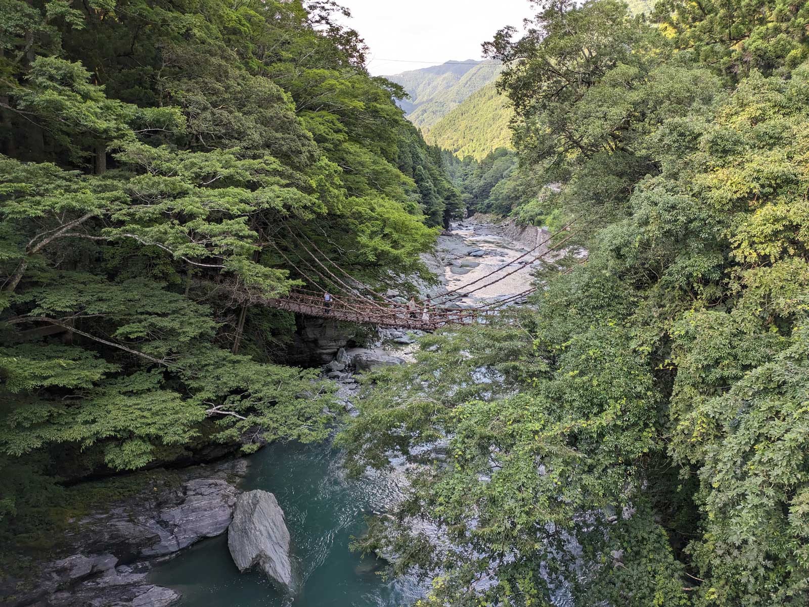 料金を払ってかずら橋を渡る。 人間は落ちるような隙間じゃないけど、スマホは余裕で落ちる、ここからスマホを落とした人、何人もいるんだろうな……落としたら下は急流だし回収不能だ。