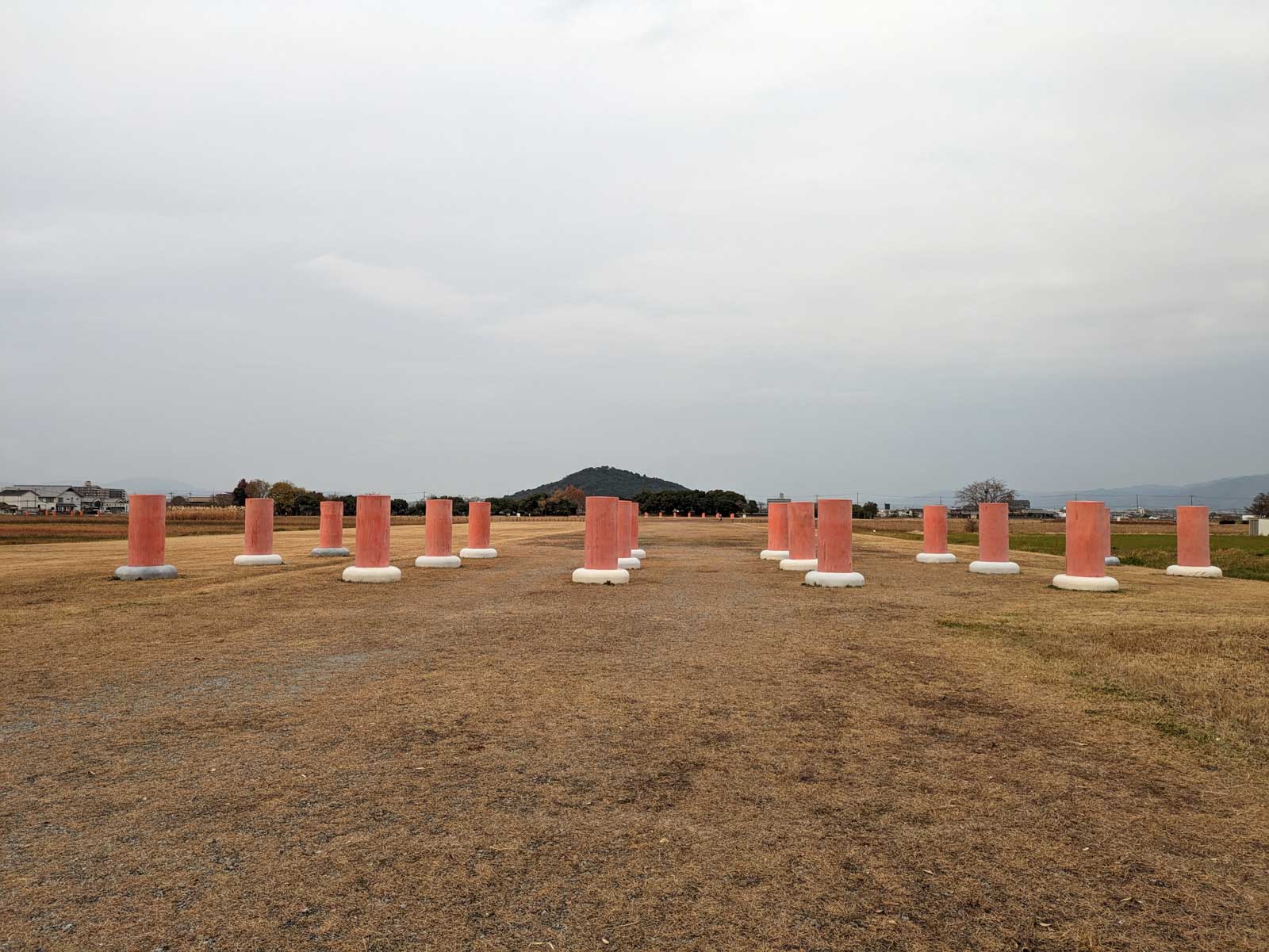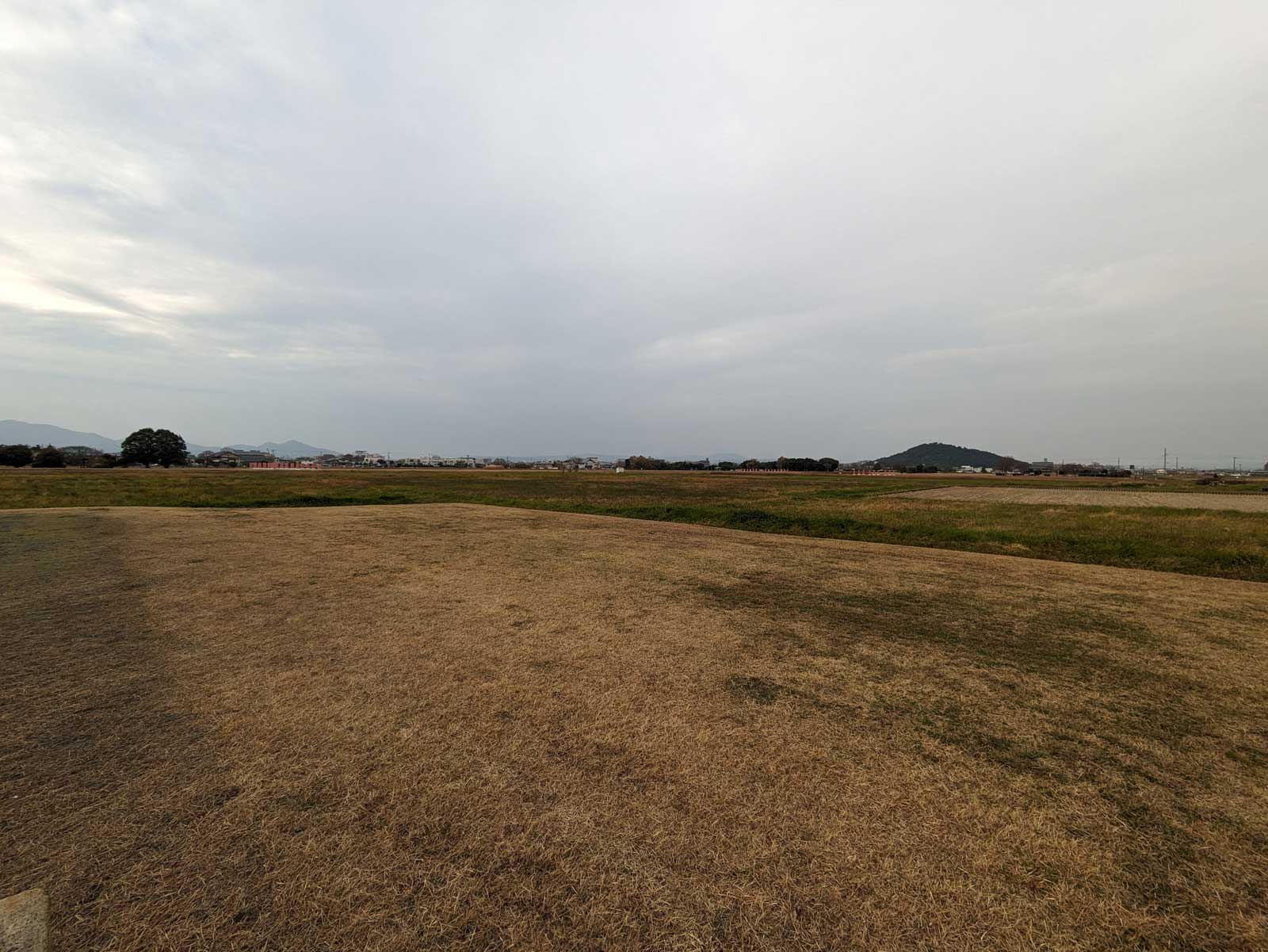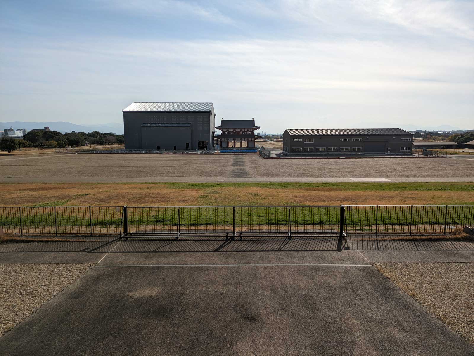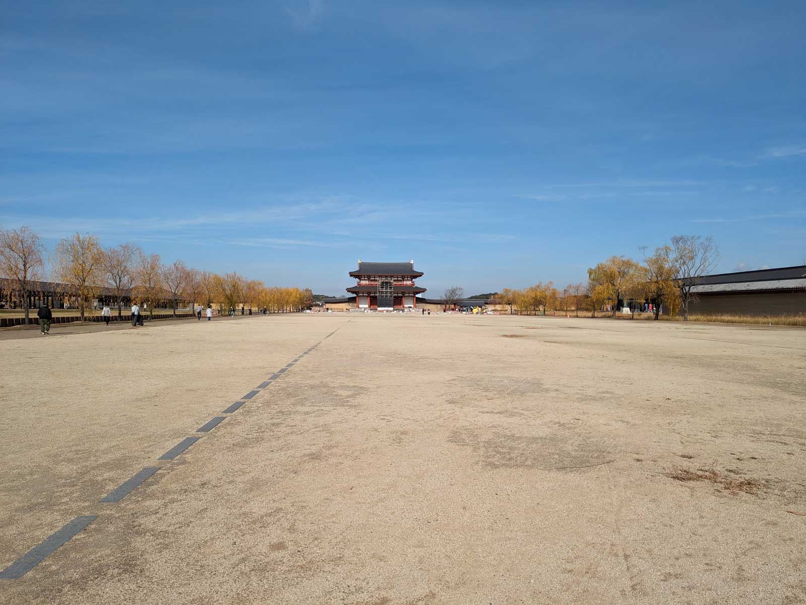 南側は復元遣唐使船が出迎えてくれた。 すぐ側に駐輪場があって、一旦そこに自転車を止めたのだが、平城宮跡は巨大すぎて、徒歩での移動は無理だと思って、すぐに自転車に戻る。 一部自転車が入れない場所があるけど、ほとんどの場所に自転車で行けるので、平城宮跡を自転車で移動する。 平城宮跡はものすごい巨大で、南北1.1km、東西1kmくらいの大きさで、ほとんどが芝生広場になっている。