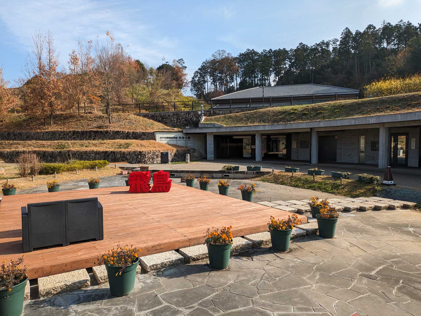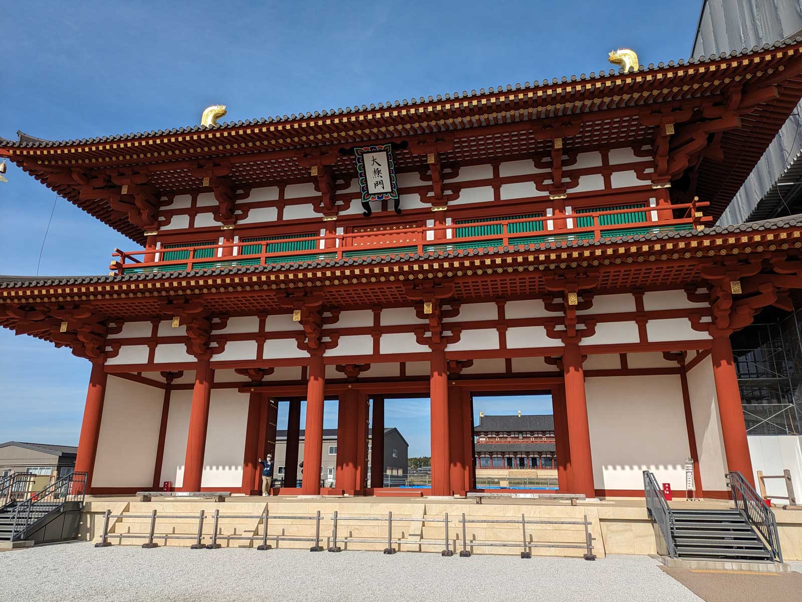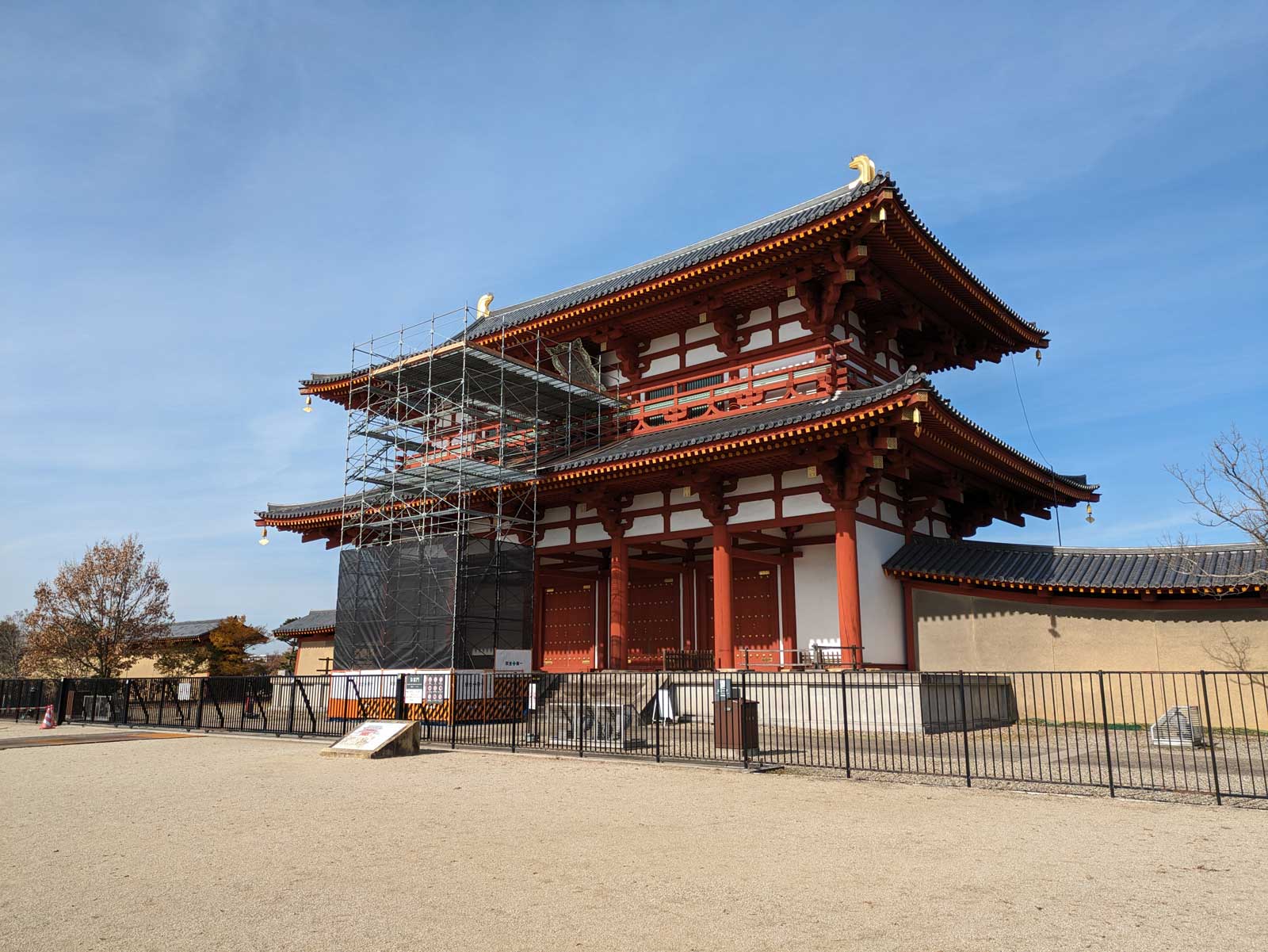 第一次大極殿院大極門は2022年3月に復元工事が完成したばかり。 すぐ右側には「東楼」を復元工事中で、あと5年くらいかかるらしい。 その工事が終わったら、足場をそのまま西へスライドさせて、「西楼」の復元をするらしい。 奥には「第一次大極殿」が2010年に復元工事が完了してそびえ立っている。 この「第一次大極殿」は遷都1,300年を記念して復元されたらしい。 平城京へ遷都されたのが西暦710年、その1,300年後である西暦2010年になるように。 その時の遷都1,300年を記念して誕生したキャラクターが、あの気持ち悪いフォルムの「せんとくん」である。