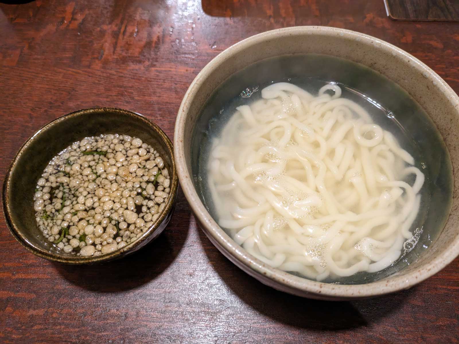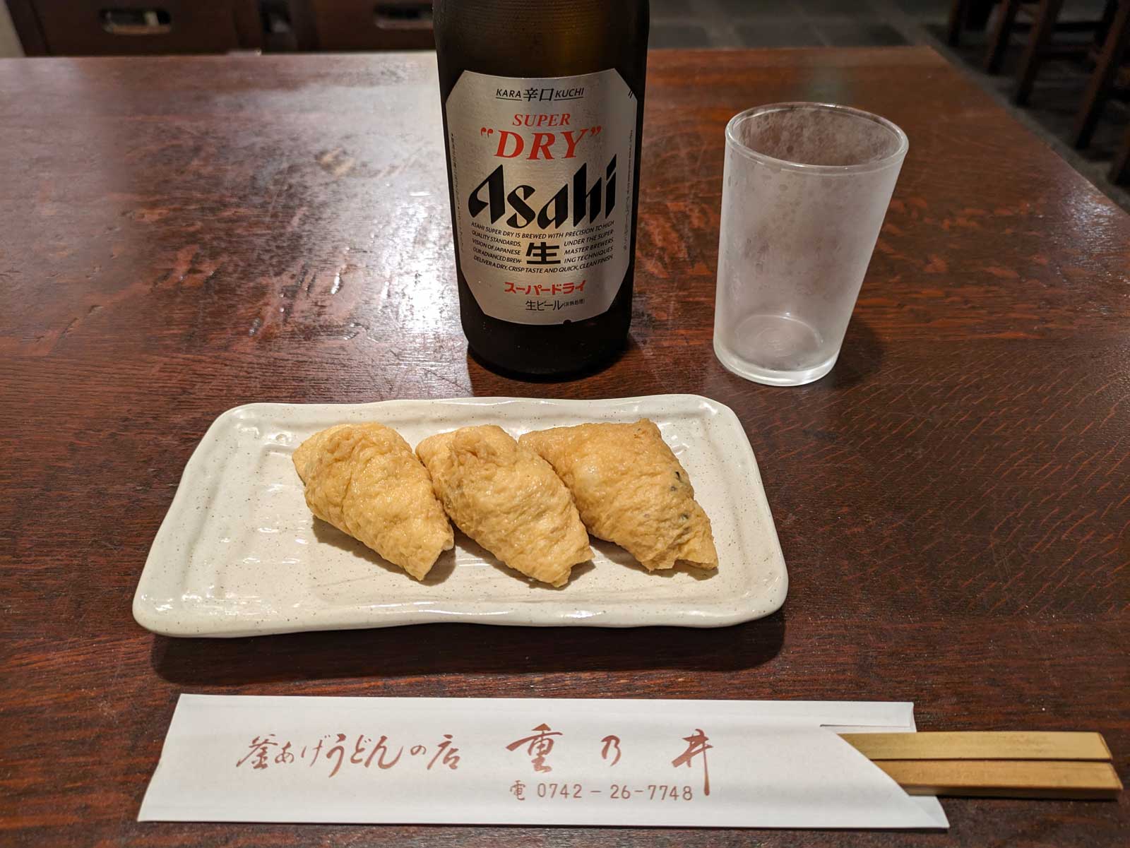 「重乃井 奈良店」という店で、釜揚げうどんと稲荷と瓶ビール。 「さぬき」を謳ってないから奈良ではこれが普通なのかもしれないが、うどんは細めで結構細切れだった。 釜揚げの出汁は最後、うどんを入れていた器に入れてスープのようにして飲むらしい。 そんなこと一度もやったこと無いがやってみた。 ちょっと薄い感じはしたが、まぁ飲める。 だけど、めっちゃ塩分入ってそうなので、あまり飲まなかった……