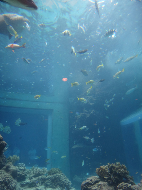 ジンベイザメの巨大水槽、水槽を支えるアクリルの厚みは、なんと60cmらしい! レンズ効果がないので、アクリルを通しても原寸大の大きさで魚を鑑賞することができる、と言っていた。