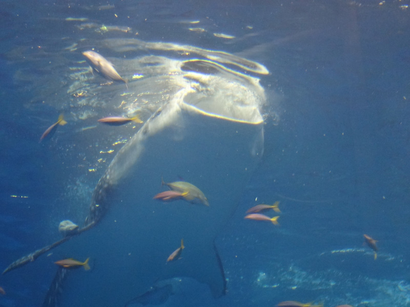 そして、美ら海水族館メインのジンベイザメのいる巨大水槽へ。 ちょうど、水槽の中の魚へのエサやりタイムで、ジンベイザメの食事のシーンを見ることができた。