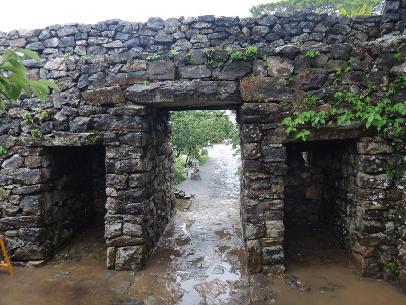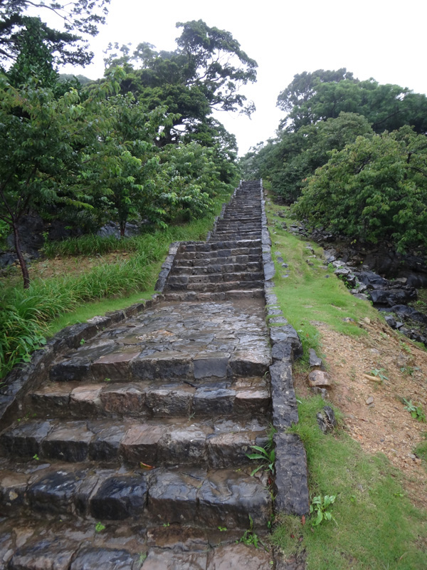 さて、まだ時間があるので、近場にある「今帰仁城跡」に向かう。 ここは世界遺産。 水族館から近かったので助かった。 17時55分くらいに到着。 夏季は19時まで営業しているので入ることができた。 チケット買って城に向かっていたら雨は土砂降りに変わった……
