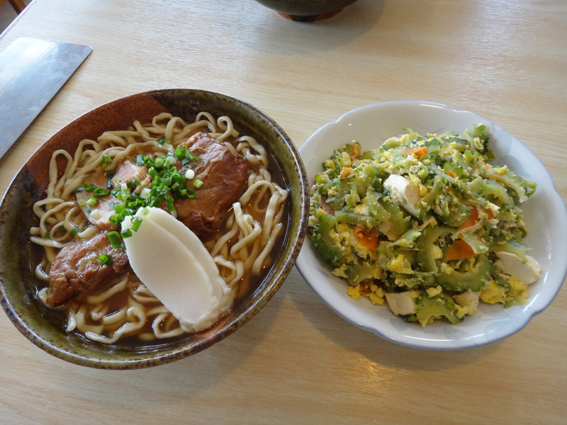 定番の「沖縄そば」と「ゴーヤチャンプルー」を注文。 かなり量が多くお腹がいっぱいだった。