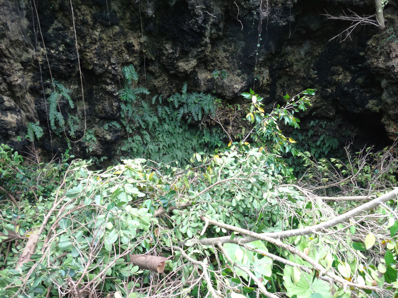 しかし、壕へ降りていく階段には伐採された木々が倒れており階段がふさがれている。 木々を乗り越えて進んでいくが、サンダルだし、毛虫とかでかいクモもいるし、近くまで行くことはできなかった……