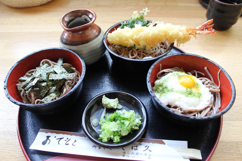 城見学の後は、目の前の「ゆらのガーデン」でお昼ご飯。 蕎麦の「そば久」という店で、三色蕎麦を食べた。 量は少なく1200円もした……