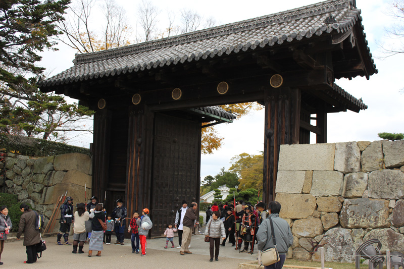 姫路城の敷地内に入る。 門付近には、兵士の格好をした人が記念撮影に応じていた。