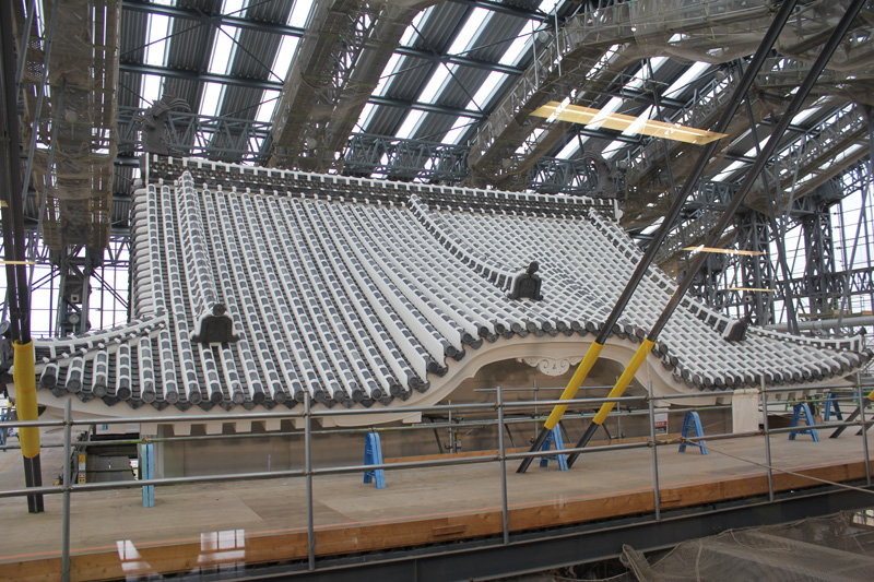 天守閣の屋根が真横にある。 今日は休みなので工事自体はしていなかったけど、鉄骨で城を囲って、かなり本格的な工事。