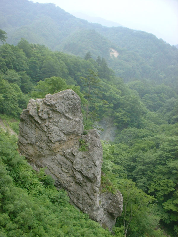クネクネしてるし坂道も急。 下手したら対向車と正面衝突しそうだし。 左側が崖、右側が山。 ずっと走っていると左側にすごい岩を発見した。