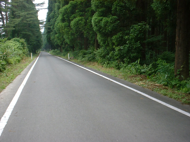 さらに長い時間走りだんだんあたりが開けてきた。 山頂は近い!? そしてついに山形県に突入した! そこから先はひたすら下り道。 地図で確認したら峠の最も高いところが840メートルもあった。 千葉県の一番高い山の2倍以上の高さ…… 下り坂はガソリンがもったいないのでエンジンを切って走る。 途中サルがいた。 写真を撮ろうと思ってカメラを持って近づいたら逃げられてしまった…… ずーっと降りてようやく平坦な場所に出た。