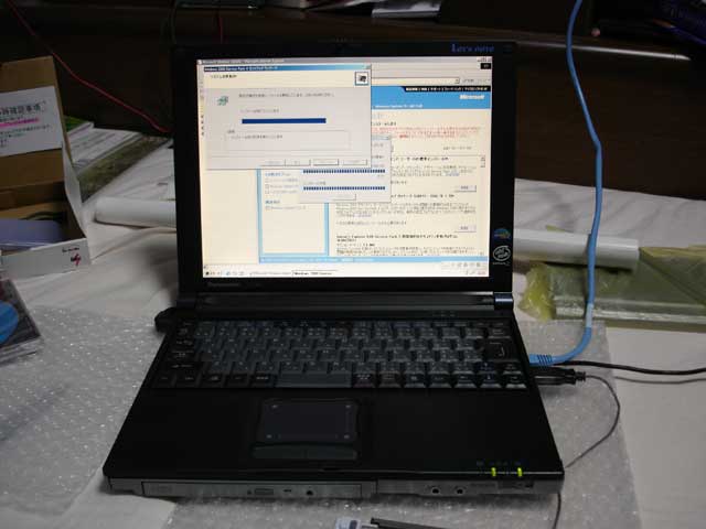 LANケーブルでルータと繋ぐ。 これでBフレッツに繋げる。 そしてWindowsのアップデート。 Windows2000SP2からSP4にアップグレードするのに3時間もかかった…… ダウンロードは早いのだが「ファイルの展開中」というのがものすごく長かった。 やっぱり性能のせい?